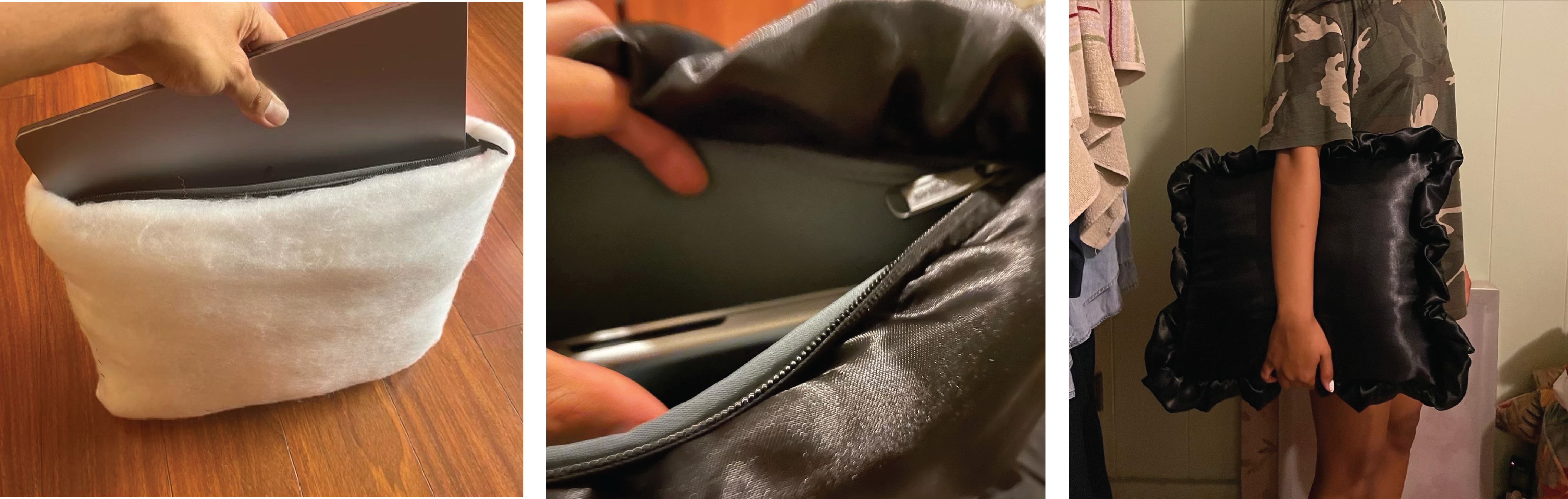 Pillow Case — for fun — I want to make the one with ruffle edges (margi and HBA, but no tuffted buttons). Made from batting, satin, and a neopreme laptop case. Love the idea of carring a pillow around in public transit. Nothing someone would steal so my laptop is in stealth. Multi-functional... fuck yeah.